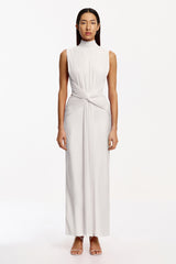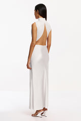 The London Gown in Ivory unites sculptural pleating with liquid satin for a striking evening silhouette. A pleated jersey bodice‚ open at the back and artfully twisted to the front waist‚ creates architectural dimension, while the bias-cut satin skirt drapes with refined elegance. Perfect for formal events, this piece is fully lined for seamless comfort.