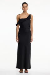 A study in architectural fluidity, The Devlyn Maxi Dress in Black reveals a striking silhouette with sculptural draping and a unique neckline. A sheer contrast sleeve and neckline detail create movement and intrigue, while the satin fabrication brings a refined finish making it perfect for formal events or elevated evening styling.