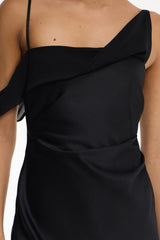 - Maxi dress - Satin fabrication - One-shoulder neckline with adjustable straps - Asymmetrical draping - Contrast sheer drape sleeve and neckline detail - Center back invisible zipper closure - Unlined