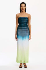 Blending contemporary form with artistic detail, the Sura Strapless Dress in Petrol Gradient showcases a striking placement print against a sleek silhouette. Crafted from soft stretch mesh and fully lined for a smooth finish, this silhouette features subtle gathering that enhances shape through the body. A refined statement piece, perfect for both daytime events and evening occasions.