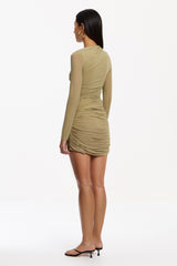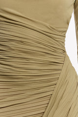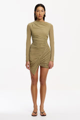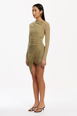 The Xayah Long Sleeve Dress in Moss is defined by sculptural elegance and directional detail. Crafted in lightweight jersey knit, its architectural silhouette features an asymmetrical neckline, expertly placed tucks at the shoulder, and a twisted drape front skirt that forms a striking focal point. Opaque and refined, Xayah is tailored for elevated occasions and modern event dressing.