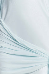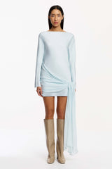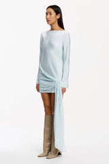 The Farrah Long Sleeve Mini Dress in Adriatic is a vision of refined artistry and fluid movement, crafted in woven crinkle satin with georgette contrast tie. Showcasing a delicate low cowl back and sheer overlay skirt that ties at the hip, this piece is designed for modern event dressing.
