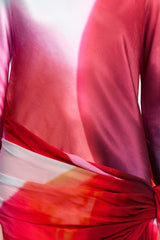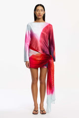 The Farrah Long Sleeve Mini Dress in Tropical Bloom is a vision of refined artistry and fluid movement, crafted in woven crinkle satin with georgette contrast tie in a fresh placement print. Showcasing a delicate low cowl back and sheer overlay skirt that ties at the hip, this piece is designed for modern event dressing.