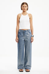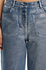 The Sabrina Jean in Silver Foil is designed to stand out. Crafted from denim with a high-shine metallic foil finish, this mid-rise silhouette features a straight leg, front and back pockets, and a button fly closure. Contrast topstitching and silver hardware elevate the finish, making it a bold choice for day-to-night dressing.