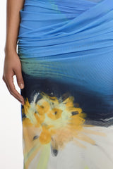The Ceira Strapless Maxi Dress in Posy Impression captures sculptural artistry with its elongated, strapless silhouette and ruched bodice. Defined by gathered overlays and a sheer panel at the waist, this design features an abstract placement print. Lightweight mesh fabrication lends itself to event dressing and modern formal occasions.