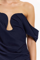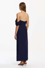 The Hilda Maxi Dress in Midnight is a statement in sculptural elegance, defined by its asymmetric sleeve drape and a vibrant, contemporary hue. An irregular shaped wire creates architectural intrigue at the front bust, while artful bodice tucks and draping contour the silhouette. Ideal for event dressing, this design balances bold structure with fluid movement for a look that commands attention.