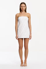 The Aryn Mini Dress in Ivory commands attention with its vivid hue and architectural silhouette. Featuring a woven satin base and a sheer tulle overlay that spirals around the body, the design creates sculptural dimension while remaining fully opaque. An invisible back zipper follows the angled overlay, offering a refined finish‚ perfect for statement event dressing and elevated evenings.