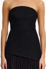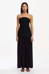 The Blyth Strapless Maxi Dress in Black captures a refined interplay of form and texture, embracing architectural shaping with a sense of quiet drama. A structured, boned cotton bodice‚ defined by precision pintuck lines‚ sculpts the silhouette, while a gathered cheesecloth skirt creates soft movement. The perfect choice for event dressing, this piece balances structure and fluidity with contemporary style.