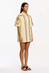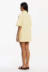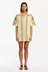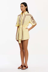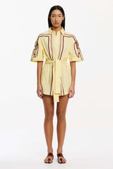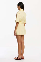 The Morrigan Mini Dress in Lemonade captures Significant Other's signature blend of ease and artisanal detail. Crafted from woven cotton shirting, this silhouette features a concealed button placket and an adjustable tie belt, allowing for a waisted finish. Embroidered accents and in-seam pockets add refined utility, while its slightly sheer fabrication lends a modern, lightweight appeal‚ perfect for warm weather occasions.