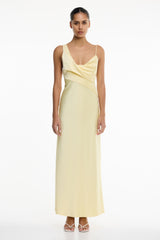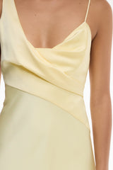 Ideal for evening soirées, the Adriana Dress in Butter showcases a bias-cut satin that drapes beautifully. The twisted front bodice with one feature wide strap adds unique elegance, while the flared skirt ensures a flattering silhouette.