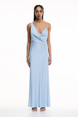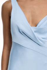 Ideal for evening soirées, the Adriana Dress in Ice Blue showcases a bias-cut satin that drapes beautifully. The twisted front bodice with one feature wide strap adds unique elegance, while the flared skirt ensures a flattering silhouette.