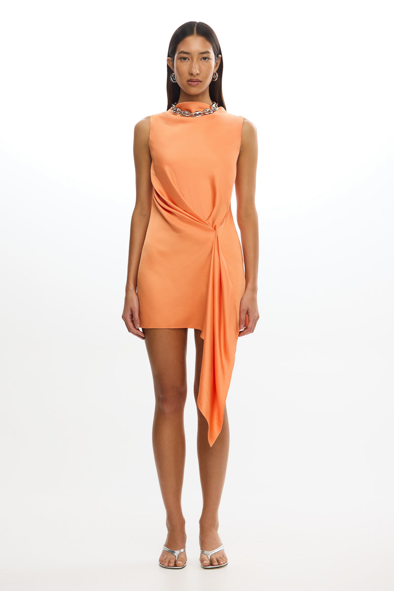 A refined silhouette for modern bridesmaids and special occasions, the Alyssa Mini Mango in is crafted from luxurious satin. This sleeveless mini style features a high neckline and an elegant asymmetric drape detail at the front. Lined through the bodice for a structured fit, the dress is finished with an invisible zip closure at the back. A timeless and sophisticated choice for any event.