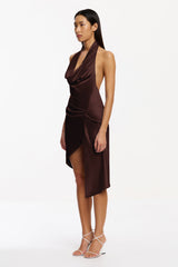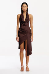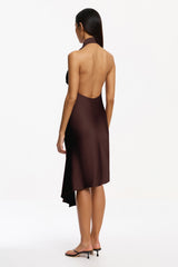 The Angela Mini Dress in Chocolate captures vibrant artistry with its defined silhouette and sculptural detailing. Featuring a deep cowl neckline held by a halter strap and an elegantly open back, this woven satin dress strikes a balance between bold structure and fluid movement. Tucks on the front skirt and an asymmetrical, draped hemline ensure dynamic appeal‚ ideal for standout event dressing.
