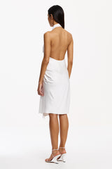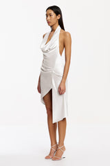 The Angela Mini Dress in Ivory captures vibrant artistry with its defined silhouette and sculptural detailing. Featuring a deep cowl neckline held by a halter strap and an elegantly open back, this woven satin dress strikes a balance between bold structure and fluid movement. Tucks on the front skirt and an asymmetrical, draped hemline ensure dynamic appeal‚ ideal for standout event dressing.