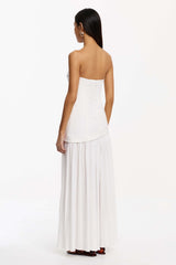 - Strapless maxi dress - Heavy woven cotton bodice - Architectural boning and pintucks - Gathered cheesecloth skirt for tactile contrast - Lined bodice; skirt unlined but opaque - Center back invisible zipper closure