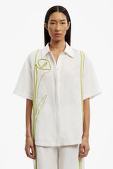 The Kori Top in Lily Cord is a lightweight essential for elevated everyday wear. Crafted from a textured linen-blend, this unlined shirt features a functional concealed button placket with delicate shell buttons and tonal embroidery across the front for added interest. Slightly sheer in finish, this piece is best styled with nude or tonal undergarments for a clean, polished look.