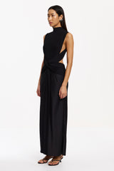 The London Gown in Black unites sculptural pleating with liquid satin for a striking evening silhouette. A pleated jersey bodice‚ open at the back and artfully twisted to the front waist‚ creates architectural dimension, while the bias-cut satin skirt drapes with refined elegance. Perfect for formal events, this piece is fully lined for seamless comfort.