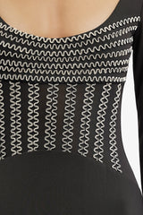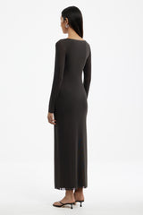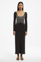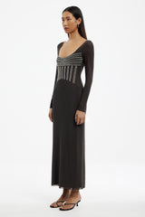 The Maddie Maxi Dress in Espresso is a modern, form-fitting silhouette crafted from stretch mesh. Sheer sleeves and a front waist panel add contrast to the lined bodice and skirt, while a zigzag braid detail highlights the bust. Finished with raw cut hems and no zip, this pull-on style is designed for effortless impact.