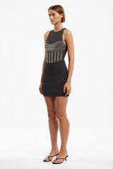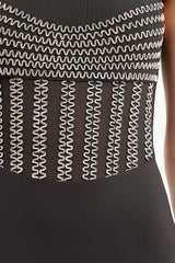 Sleek and structured, the Maddie Mini Dress in Espresso is designed with textural contrast and sheer detailing. Featuring a zigzag braid across the bodice, this style includes a sheer front waist panel, power mesh-lined bodice, and jersey-lined back and skirt. Raw cut hems and a centre-back invisible zip complete the look with a clean, modern finish.