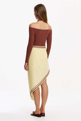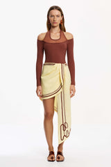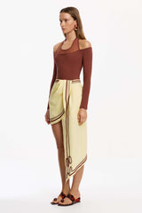 The Morrigan Skirt in Lemonade redefines modern tailoring with its sculptural mini silhouette and artful detailing. Crisp cotton provides a structured canvas for intricate embroidery, front draping, and precision waist tucks. An asymmetrical hem introduces a bold, architectural element - perfect for event dressing or sunny occasions.