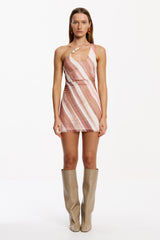 The Nami Dress in Carob Stripe channels sculptural modernity with refined ease. Defined by an asymmetrical neckline adorned with bead detailing, this fully lined knit silhouette features artful gathering through the side waist to frame the form. The distinctive striped print and satisfying opacity make it a perfect choice for event dressing or elevated daywear.