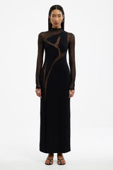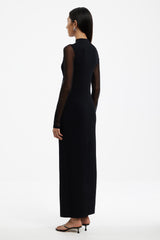 The Neyma Long Sleeve Maxi Dress in Black is a sleek, unlined silhouette crafted from soft jersey with sheer knit panels through the front and sleeves. A high neckline adds balance, while the pullover fit keeps the look clean and effortless—ideal for evenings that call for subtle impact.