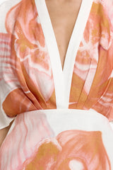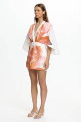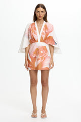 The Nyla Mini Dress in Tangerine Bloom is your go-to for effortless summer style. Crafted from breathable linen with a striking hand painted placement print, this dress features a deep V neckline and pleated bodice for a touch of elegance. The cape sleeves and lined skirt make it perfect for both day and evening events.