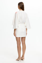 - Mini dress - Deep V front neckline - Cape sleeves - Woven linen with exclusive placement print - Waist pleats at bodice - Lined skirt; unlined bodice (slightly sheer) - Center back invisible zipper closure