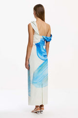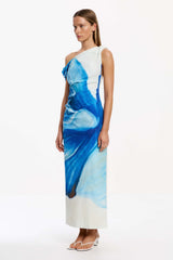 The Olea Dress in Hyperbloom captivates with an architectural silhouette and a bold placement print. Defined by an asymmetrical neckline, the dress features a sculptural twisted strap at the left shoulder and a dramatic off-shoulder drape on the right. Precision tucks at the waist and hip create a refined, contoured finish, perfect for formal events or elevated occasions.