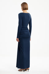 Elegant and easy to wear, the Sarlyn Long Sleeve Maxi Dress in Slate is crafted from soft crepe jersey for a fluid, form-skimming silhouette. Featuring a draped cowl neckline and twist detail at the front skirt, this pull-on style is lined through the bodice for comfort, with sheer sleeves and skirt for a lightweight finish. Ideal for relaxed events or elevated day-to-evening dressing.